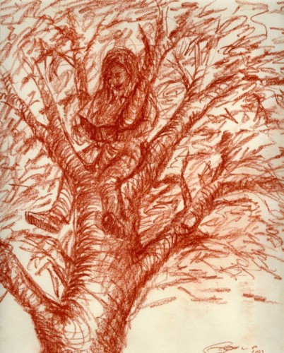 Girl reading in tree (2001) sanguine on paper (8.5" x 10")