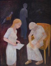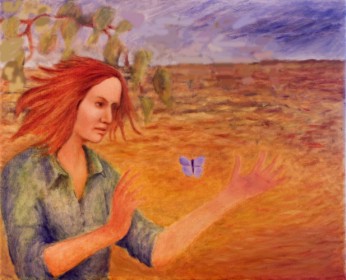 (left) Given this photograph Gene Gould took when he was working on this painting in 2004, it seems logical to refer to it as "Butterfly girl". However... (right) This is how this (presumably unfinished) painting now looks. |