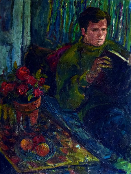 "GENE GOULD READING" (30" x 40") This unsigned artwork, thickly painted on a masonite board, is clearly a portrait of young Gene Gould reading. Two details confirm this idea: 1) There is a striking resemblance with the way Gene Gould looked at a young age, as evidenced by the photo shown below. 2) The model in this painting is missing the little finger of his right hand, which was the case for Gene Gould following a farm equipment accident that happened during his childhood.